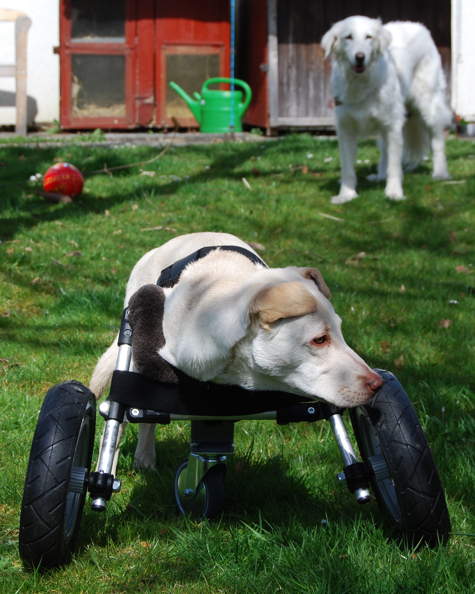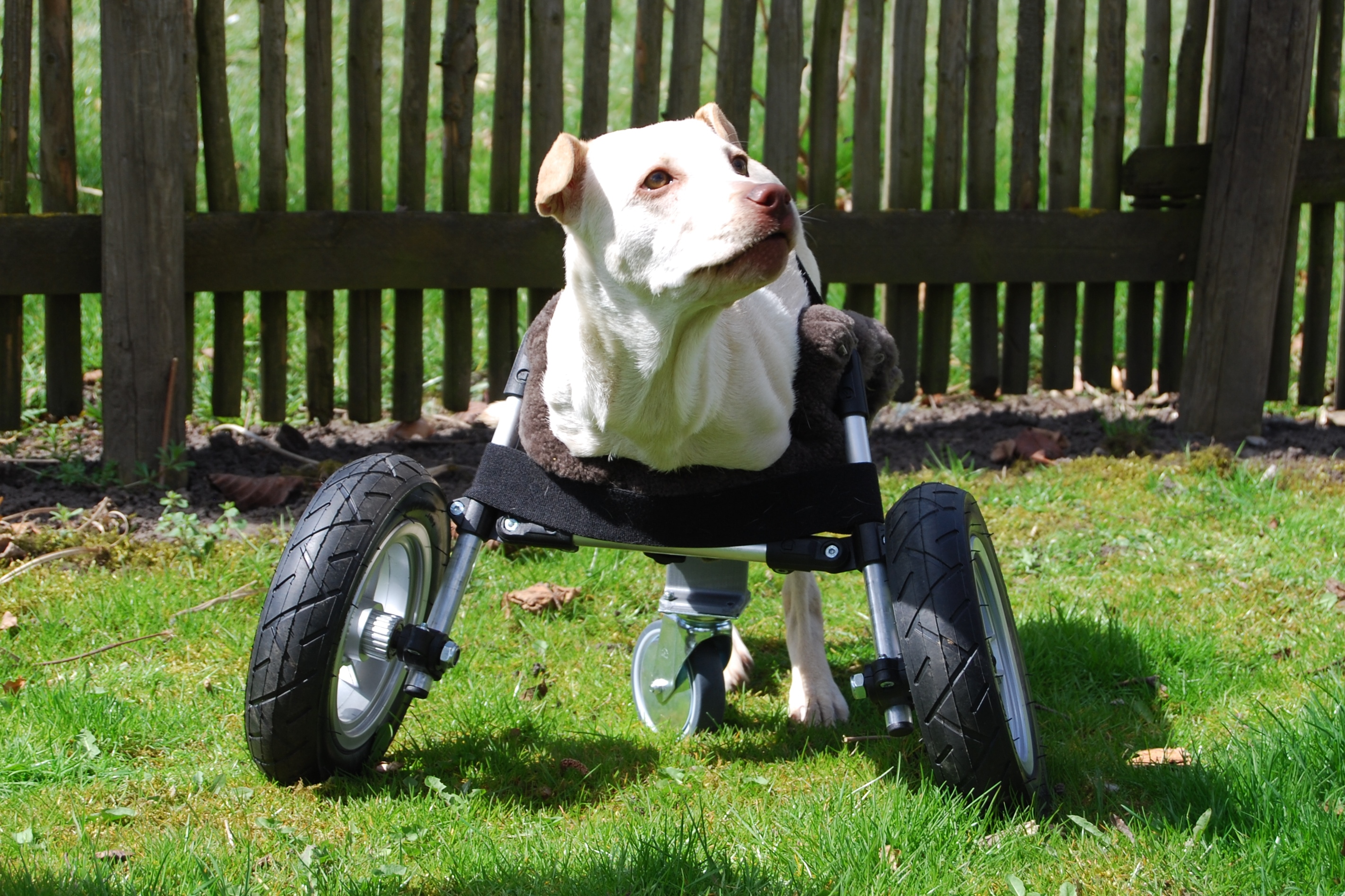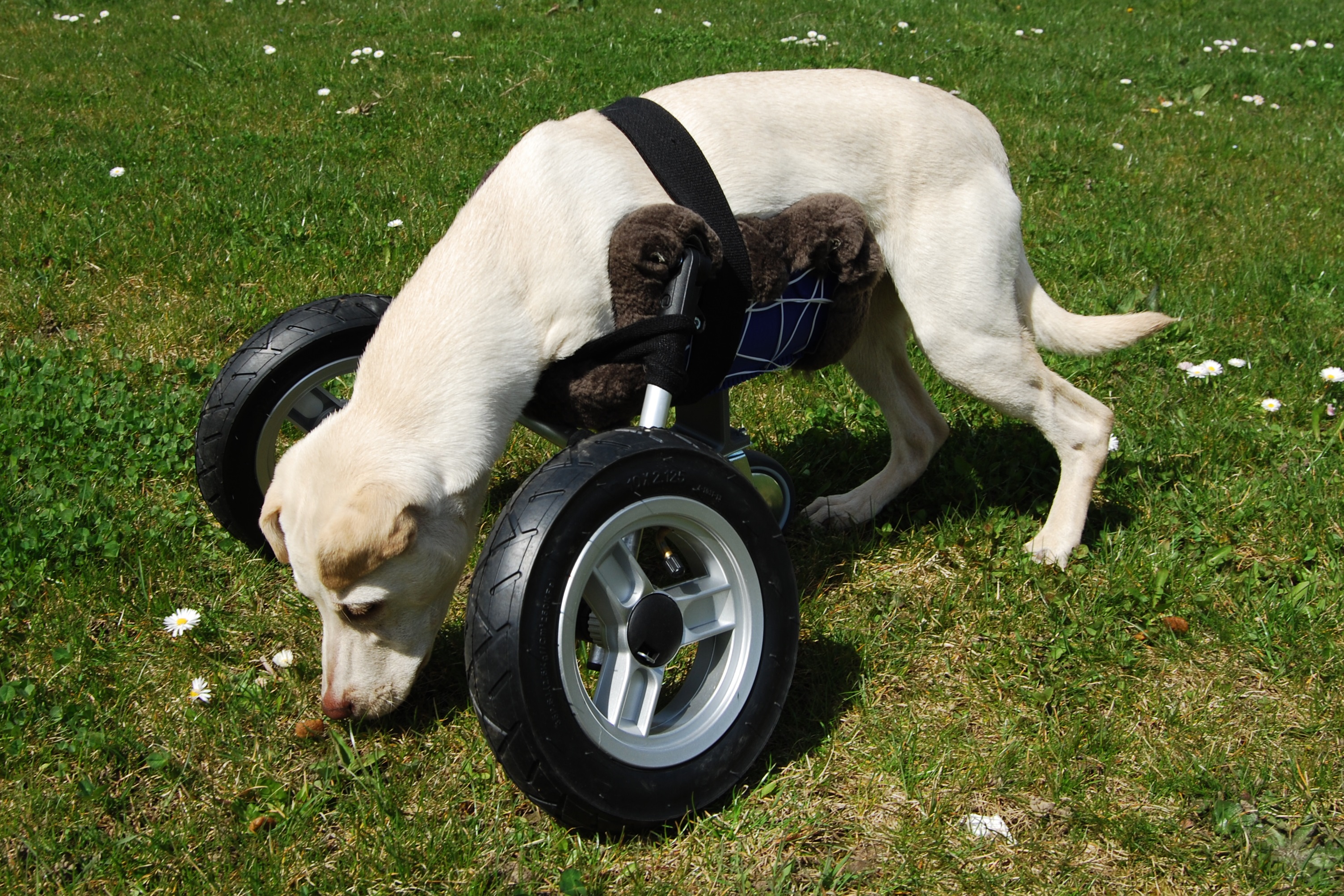 Bild 1: Der Hunderollstuhl aus dem 3D-Drucker ersetzt Luisa die Vorderbeine.